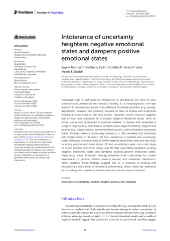 Morriss, J., Goh, K., Hirsch, C. R. and Dodd, H. F. (2023) Intolerance of uncertainty heightens negative emotional states and dampens positive emotional states. Frontiers in Psychiatry, 14. 1147970. ISSN 1664-0640 doi: 10.3389/fpsyt.2023.1147970