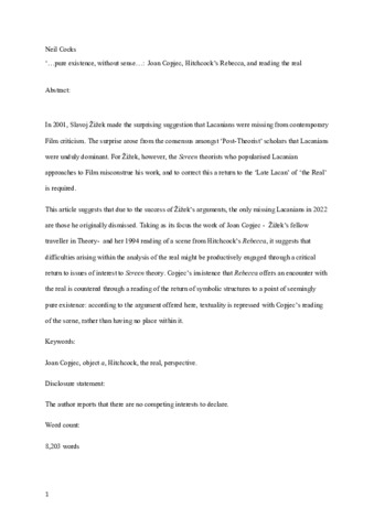 Cocks, N. (2023) "…pure existence, without sense…": Joan Copjec, Hitchcock’s Rebecca, and reading the real. Textual Practice. pp. 1-19. ISSN 1470-1308 doi: 10.1080/0950236X.2023.2214122