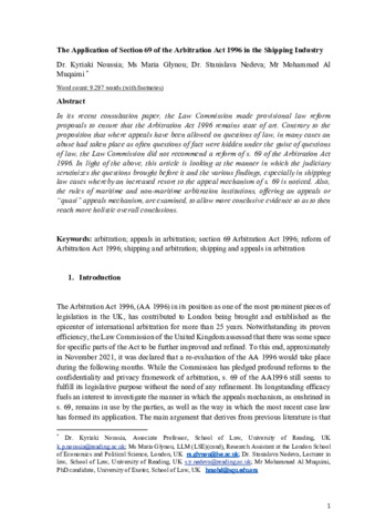 In its recent consultation paper, the Law Commission made provisional law reform proposals to ensure that the Arbitration Act 1996 remains state of art. Contrary to the proposition that where appeals have been allowed on questions of law, in many cases an abuse had taken place as often questions of fact were hidden under the guise of questions of law, the Law Commission did not recommend a reform of s. 69 of the Arbitration Act 1996. In light of the above, this article is looking at the manner in which the judiciary scrutinizes the questions brought before it and the various findings, especially in shipping law cases whereby an increased resort to the appeal mechanism of s. 69 is noticed. Also, the rules of maritime and non-maritime arbitration institutions, offering an appeals or “quasi” appeals mechanism, are examined, to allow more conclusive evidence so as to then reach more holistic overall conclusions.
