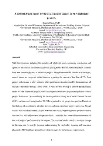 With the objectives including the reduction of whole life costs, increasing construction and operation efficiencies and enhancing service quality, Public-Private Partnership (PPP) schemes have been increasingly used in healthcare projects throughout the world. Besides its advantages, several issues were reported in the literature regarding the success of healthcare PPPs. Poor project performance is a key concern, while performance is determined by the occurrence of multiple interrelated factors. In this study, it was aimed to develop a network-based success model for PPP healthcare projects, which encompasses the whole project life cycle and various project dimensions, by considering the interdependence among the Critical Success Factors (CSFs). A framework comprised of 33 CSFs organized in six groups was proposed based on the findings of an extensive literature review and semi-structured expert interviews. Project success was modelled with the Analytic Network Process (ANP) through three group discussion sessions held with experts from the private sector. The model was tested via the assessment of two real projects’ performance by the experts. The proposed model, which is a unique attempt in this area, can be used by decision-makers during the pre-tender, planning and execution phases of a PPP healthcare project to develop strategies for performance improvement.