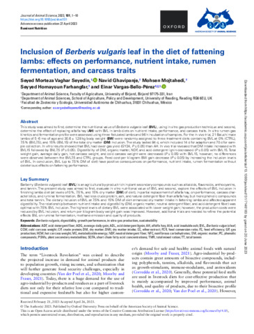 Inclusion of Berberis vulgaris leaf in the diet of fattening lambs: effects on performance, nutrient intake, rumen fermentation, and carcass traits.