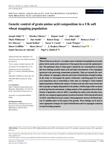 Oddy, J. orcid id iconORCID: https://orcid.org/0000-0001-6792-1152, Chhetry, M., Awal, R., Addy, J., Wilkinson, M., Smith, D., King, R., Hall, C., Testa, R., Murray, E., Raffan, S., Curtis, T. Y., Wingen, L., Griffiths, S., Berry, S., Elmore, J. S. orcid id iconORCID: https://orcid.org/0000-0002-2685-1773, Cryer, N. orcid id iconORCID: https://orcid.org/0000-0002-3684-143X, Moreira de Almeida, I. and Halford, N. G. orcid id iconORCID: https://orcid.org/0000-0001-6488-2530 (2023) Genetic control of grain amino acid composition in a UK soft wheat mapping population. The Plant Genome. e20335. ISSN 1940-3372 doi: 10.1002/tpg2.20335