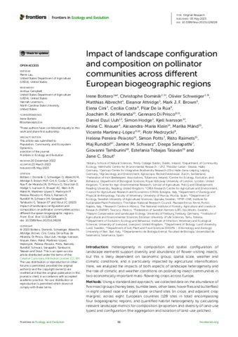 Bottero, I., Dominik, C., Schweiger, O., Albrecht, M., Attridge, E., Brown, M. J. F., Cini, E., Costa, C., De la Rúa, P., de Miranda, J. R., Di Prisco, G., Uuh, D. D., Hodge, S., Ivarsson, K., Knauer, A. C., Klein, A.-M., Mänd, M., Martínez-López, V., Medrzycki, P., Pereira-Peixoto, H., Potts, S. orcid id iconORCID: https://orcid.org/0000-0002-2045-980X, Raimets, R., Rundlöf, M., M. Schwarz, J., Senapathi, D. orcid id iconORCID: https://orcid.org/0000-0002-8883-1583, Tamburini, G., Talaván, E. T. and Stout, J. C. (2023) Impact of landscape configuration and composition on pollinator communities across different European biogeographic regions. Frontiers in ecology and evolution, 11. ISSN 2296-701X doi: 10.3389/fevo.2023.1128228