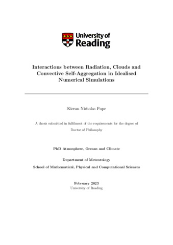 Pope, K. N. (2023) Interactions between radiation, clouds and convective self-aggregation in idealised numerical simulations. PhD thesis, University of Reading. doi: 10.48683/1926.00111980