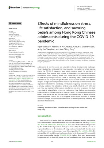 Effects of mindfulness on stress, life satisfaction, and savoring beliefs among Hong Kong Chinese adolescents during the COVID-19 pandemic.