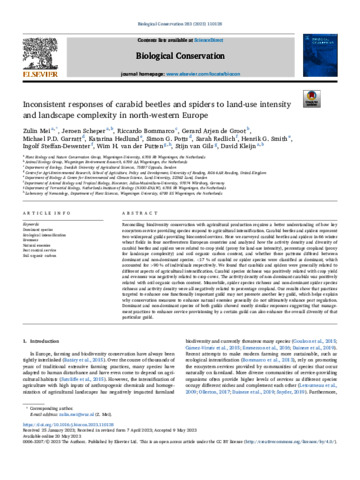 Inconsistent responses of carabid beetles and spiders to land-use intensity and landscape complexity in north-western Europe.