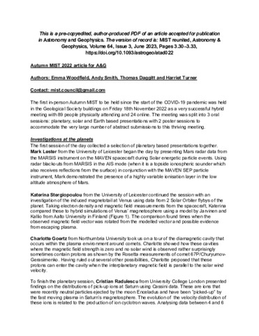 Woodfield, E., Smith, A., Daggitt, T. and Turner, H. (2023) MIST reunited. Astronomy & Geophysics, 64 (3). 3.30-3.33. ISSN 1468-4004 doi: 10.1093/astrogeo/atad022
