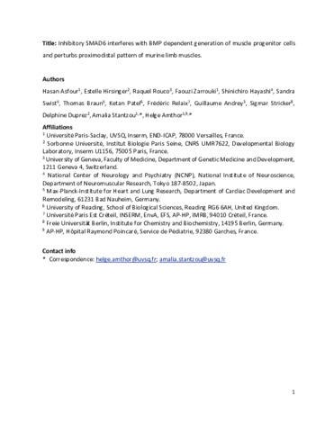 Inhibitory SMAD6 interferes with BMP-dependent generation of muscle progenitor cells and perturbs proximodistal pattern of murine limb muscles.