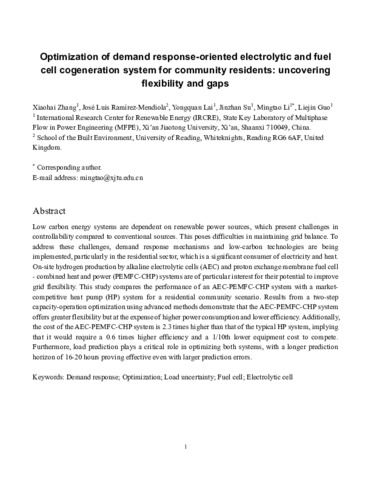 Zhang, X., Ramírez-Mendiola, J. L. orcid id iconORCID: https://orcid.org/0000-0001-7666-7440, Lai, Y., Su, J. orcid id iconORCID: https://orcid.org/0000-0003-1757-4900, Li, M. and Guo, L. (2023) Optimization of demand response-oriented electrolytic and fuel cell cogeneration system for community residents: uncovering flexibility and gaps. Energy Conversion and Management, 287. 117099. ISSN 0196-8904 doi: 10.1016/j.enconman.2023.117099