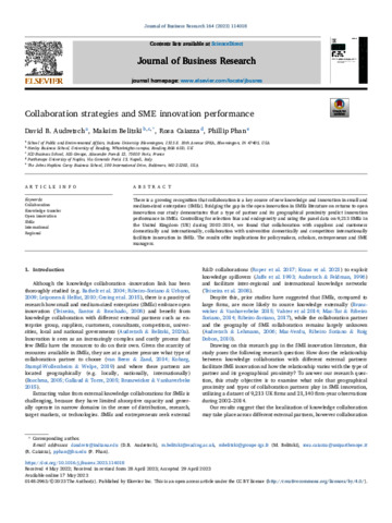 Audretsch, D. B., Belitski, M. orcid id iconORCID: https://orcid.org/0000-0002-9895-0105, Caiazza, R. orcid id iconORCID: https://orcid.org/0000-0001-6067-9973 and Phan, P. orcid id iconORCID: https://orcid.org/0000-0002-1366-1604 (2023) Collaboration strategies and SME innovation performance. Journal of Business Research, 164. 114018. ISSN 1873-7978 doi: 10.1016/j.jbusres.2023.114018