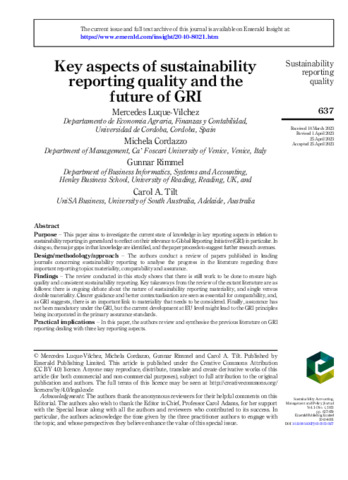 Purpose This paper aims to investigate the current state of knowledge in key reporting aspects in relation to sustainability reporting in general and to reflect on their relevance to Global Reporting Initiative (GRI) in particular. In doing so, the major gaps in that knowledge are identified, and the paper proceeds to suggest further research avenues. Design/methodology/approach The authors conduct a review of papers published in leading journals concerning sustainability reporting to analyse the progress in the literature regarding three important reporting topics: materiality, comparability and assurance. Findings The review conducted in this study shows that there is still work to be done to ensure high-quality and consistent sustainability reporting. Key takeaways from the review of the extant literature are as follows: there is ongoing debate about the nature of sustainability reporting materiality, and single versus double materiality. Clearer guidance and better contextualisation are seen as essential for comparability, and, as GRI suggests, there is an important link to materiality that needs to be considered. Finally, assurance has not been mandatory under the GRI, but the current development at EU level might lead to the GRI principles being incorporated in the primary assurance standards. Practical implications In this paper, the authors review and synthesise the previous literature on GRI reporting dealing with three key reporting aspects. Social implications The authors extract some takeaways from the literature on materiality, comparability and assurance that will all be key challenges for GRI in the future. Originality/value This paper provides an updated review of the literature on GRI reporting dealing with three key reporting aspects.