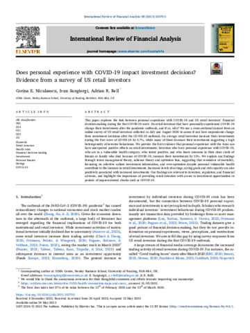 Niculescu, C. E., Sangiorgi, I. orcid id iconORCID: https://orcid.org/0000-0002-8344-9983 and Bell, A. R. orcid id iconORCID: https://orcid.org/0000-0003-4531-0072 (2023) Does personal experience with COVID-19 impact investment decisions? Evidence from a survey of US retail investors. International Review of Financial Analysis, 88. 102703. ISSN 1057-5219 doi: 10.1016/j.irfa.2023.102703