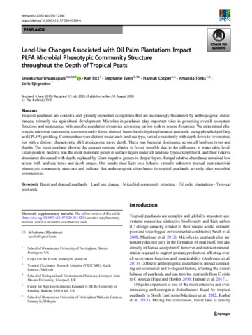 Dhandapani, S. orcid id iconORCID: https://orcid.org/0000-0001-8522-5177, Ritz, K., Evers, S., Cooper, H., Tonks, A. and Sjögersten, S. (2020) Land-use changes associated with oil palm plantations I impact PLFA microbial phenotypic community structure throughout the depth of tropical peats. Wetlands, 40. pp. 2351-2366. ISSN 1943-6246 doi: 10.1007/s13157-020-01342-0