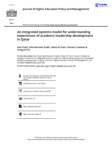 Floyd, A. orcid id iconORCID: https://orcid.org/0000-0002-2008-7831, Qadhi, S. M., Al-Thani, H., Chaaban, Y. and Du, X. (2023) An integrated systems model for understanding experiences of academic leadership development in Qatar. Journal of Higher Education Policy and Management, 45 (6). pp. 690-705. ISSN 1469-9508 doi: 10.1080/1360080X.2023.2225148
