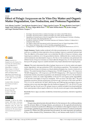 This study determined the effect of pelagic Sargassum on in vitro dry matter and organic matter degradation, total gas production (TGP), and protozoa population. The treatments were different levels of Sargassum inclusion on a basal substrate (Stargrass hay; Cynodon nlemfuensis) as follows: T0 (control treatment based on Stargrass hay), T10 (90% Stargrass hay + 10% Sargassum), T20 (80% Stargrass hay + 20% Sargassum), and T30 (70% Stargrass hay + 30% Sargassum). Ruminal fermentation kinetics and protozoa population were determined during 72 h of in vitro incubations. Compared to control, dry matter degradability at 48 and 72 h and organic matter degradability at 24 and 48 h were higher in Sargassum treatments. TGP was lower with T20 at 48 h. The total population of protozoa and the concentration of Entodinium spp. were lower at T20 at 48 h and T30 at 72 h. Cl, S, Ca, K, and Zn (103, 5.97, 88.73, 285.70 g/kg, and 15,900 mg/kg) were high in Sargassum, reaching twice or even nine times higher than the contents in Stargrass (11.37, 1.60, 43.53, 87.73 g/kg, and 866.67 mg/kg). Overall, up to 30% pelagic Sargassum could be included in hay-based substrates from tropical grasses without negative effects on in vitro dry matter and organic matter degradability.