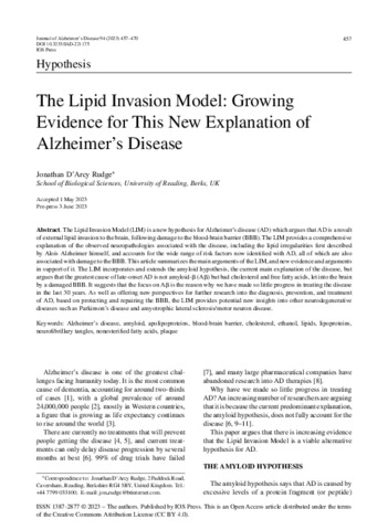 Rudge, J. D.’A. (2023) The Lipid Invasion Model: growing evidence for this new explanation of Alzheimer’s disease. Journal of Alzheimer's Disease, 94 (2). pp. 457-470. ISSN 1875-8908 doi: 10.3233/jad-221175