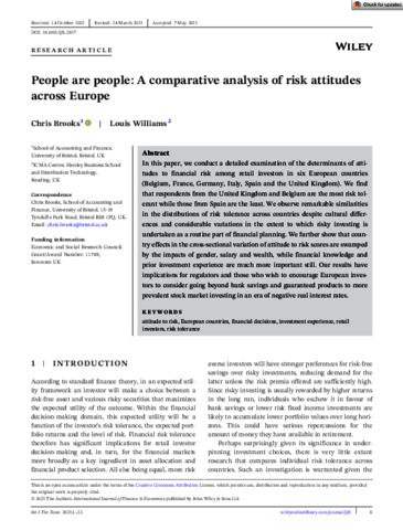 In this paper, we conduct a detailed examination of the determinants of attitudes to financial risk among retail investors in six European countries (Belgium, France, Germany, Italy, Spain and the United Kingdom). We find that respondents from the United Kingdom and Belgium are the most risk tolerant while those from Spain are the least. We observe remarkable similarities in the distributions of risk tolerance across countries despite cultural differences and considerable variations in the extent to which risky investing is undertaken as a routine part of financial planning. We further show that country effects in the cross-sectional variation of attitude to risk scores are swamped by the impacts of gender, salary and wealth, while financial knowledge and prior investment experience are much more important still. Our results have implications for regulators and those who wish to encourage European investors to consider going beyond bank savings and guaranteed products to more prevalent stock market investing in an era of negative real interest rates.