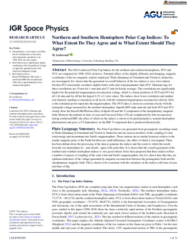 The IAGA-endorsed Polar Cap Indices for the northern and southern hemispheres, PCN and PCS , are compared for 1998-2018, inclusive. Potential effects of the slightly-different, and changing, magnetic coordinates of the two magnetic stations employed, Thule (Qaanaaq) in Greenland and Vostok in Antarctica, are investigated. It is shown that the agreement in overall behaviour of the two indices is very close indeed but that PCS consistently correlates slightly better with solar wind parameters than PCN . Optimum lags for these correlations are 19 min for 1-min data and 37 min for hourly averages. The correlations are significantly highest for the predicted magnetopause reconnection voltage, which is a linear predictor of PCN and PCS for all 1-hour data and for all but the largest 0.1{\% of 1-min values. The indices show lower correlation and marked non-linearity (tending to saturation) at all levels with the estimated magnetopause reconnection electric field or the estimated power input into the magnetosphere. The PCN index is shown to correlate closely with the transpolar voltage measured by the northern-hemisphere SuperDARN radar network and both PCN and PCS clearly show the Russell-McPherron effect of dipole tilt and the Y-component of the interplanetary magnetic field. However the patterns in time-of-year and Universal Time ( UT ) are complicated by lobe reconnection during northward-IMF, the effect of which on the indices is shown to be predominantly a summer hemisphere phenomenon and gives a UT dependence on the IMF Y-component that is predicted theoretically.