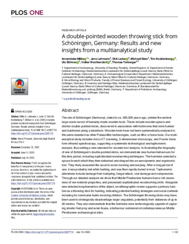 Milks, A. G. orcid id iconORCID: https://orcid.org/0000-0003-0779-6200, Lehmann, J., Leder, D., Sietz, M., Koddenberg, T., Böhner, U., Wachtendorf, V. and Terberger, T. (2023) A double-pointed wooden throwing stick from Schöningen, Germany: results and new insights from a multianalytical study. PLoS ONE, 18 (7). e0287719. ISSN 1932-6203 doi: 10.1371/journal.pone.0287719