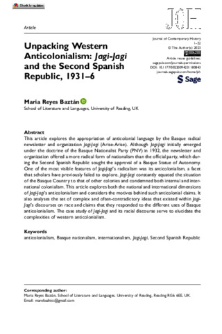 Reyes Baztán, M. orcid id iconORCID: https://orcid.org/0000-0003-1145-9231 (2023) Unpacking Western anticolonialism: Jagi-Jagi and the Second Spanish Republic, 1931–6. Journal of Contemporary History, 58 (4). pp. 591-612. ISSN 1461-7250 doi: 10.1177/00220094231180843