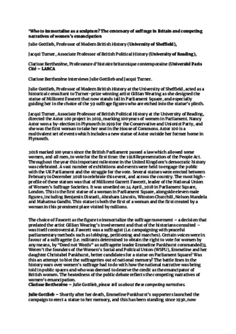 Gottlieb, J. orcid id iconORCID: https://orcid.org/0000-0001-5089-4768, Turner, J. orcid id iconORCID: https://orcid.org/0000-0001-5089-4768 and Berthezène, C. (2023) Who to immortalise as a sculpture? The centenary of suffrage in Britain and competing narratives of women’s emancipation. Passés futurs, 13. ISSN 2558-7935
