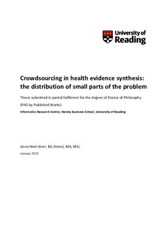 Noel-Storr, A. (2022) Crowdsourcing in health evidence synthesis: the distribution of small parts of the problem. PhD thesis, University of Reading. doi: 10.48683/1926.00112412