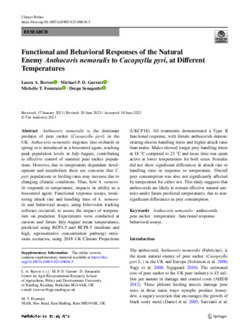 Reeves, L. A., Garratt, M. P. D. orcid id iconORCID: https://orcid.org/0000-0002-0196-6013, Fountain, M. T. and Senapathi, D. orcid id iconORCID: https://orcid.org/0000-0002-8883-1583 (2023) Functional and behavioral responses of the natural enemy Anthocoris nemoralis to Cacopsylla pyri, at different temperatures. Journal of Insect Behavior, 36 (3). pp. 222-238. ISSN 0892-7553 doi: 10.1007/s10905-023-09836-5