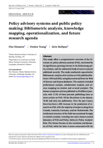 Hussain, F., Tsang, D. and Rafique, Z. (2024) Policy advisory systems and public policy making: bibliometric analysis, knowledge mapping, operationalization, and future research agenda. Review of Policy Research, 41 (5). pp. 713-739. ISSN 1541-1338 doi: 10.1111/ropr.12564