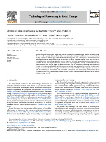 Audretsch, D. B., Belitski, M., Caiazza, R. and Siegel, D. (2023) Effects of open innovation in startups: theory and evidence. Technological Forecasting and Social Change, 194. 122694. ISSN 0040-1625 doi: 10.1016/j.techfore.2023.122694