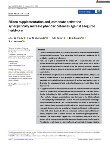 Johnson, S.N., Waterman, J.M., Wuhrer, R., Rowe, R.C., Hall, C.R. & Cibils-Stewart, X. (2021b) Siliceous and non-nutritious: Nitrogen limitation increases anti-herbivore silicon defences in a model grass. Journal of Ecology, 109, 3767-3778.