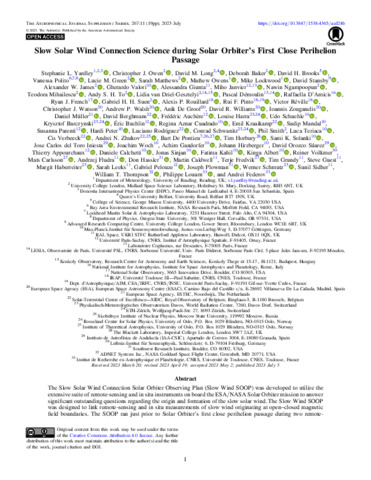 The Slow Solar Wind Connection Solar Orbiter Observing Plan (Slow Wind SOOP) was developed to utilize the extensive suite of remote-sensing and in situ instruments on board the ESA/NASA Solar Orbiter mission to answer significant outstanding questions regarding the origin and formation of the slow solar wind. The Slow Wind SOOP was designed to link remote-sensing and in situ measurements of slow wind originating at open–closed magnetic field boundaries. The SOOP ran just prior to Solar Orbiter's first close perihelion passage during two remote-sensing windows (RSW1 and RSW2) between 2022 March 3–6 and 2022 March 17–22, while Solar Orbiter was at respective heliocentric distances of 0.55–0.51 and 0.38–0.34 au from the Sun. Coordinated observation campaigns were also conducted by Hinode and IRIS. The magnetic connectivity tool was used, along with low-latency in situ data and full-disk remote-sensing observations, to guide the target pointing of Solar Orbiter. Solar Orbiter targeted an active region complex during RSW1, the boundary of a coronal hole, and the periphery of a decayed active region during RSW2. Postobservation analysis using the magnetic connectivity tool, along with in situ measurements from MAG and SWA/PAS, showed that slow solar wind originating from two out of three of the target regions arrived at the spacecraft with velocities between ∼210 and 600 km s−1. The Slow Wind SOOP, despite presenting many challenges, was very successful, providing a blueprint for planning future observation campaigns that rely on the magnetic connectivity of Solar Orbiter.