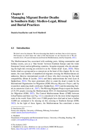 Stauffacher, D. and Maddrell, A. orcid id iconORCID: https://orcid.org/0000-0003-2941-498X (2023) Managing migrant border deaths in Southern Italy: medico-legal, ritual and burial practices. In: Maddrell, A. orcid id iconORCID: https://orcid.org/0000-0003-2941-498X, Kmec, S., Uteng, T. P. and Westendorp, M. (eds.) Mobilities in Life and Death. Negotiating Room for Migrants and Minorities in European Cemeteries. IMISCOE Research Series (IMIS). Springer, Cham, pp. 65-83. ISBN 9783031282836 doi: 10.1007/978-3-031-28284-3_4
