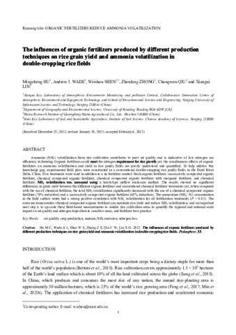 The influences of organic fertilizers produced by different production techniques on rice grain yield and ammonia volatilization in double-cropping rice fields.