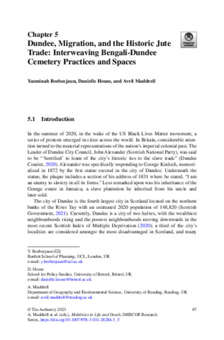 In this chapter we draw on both postcolonial and mobilities scholarship to engage with the neglected intersections between mobilities and colonialism. Specifically, we argue this colonial legacy set the conditions for present day Bengali and other Scottish Muslims to create their understandings of home and belonging. We explore this idea through the development and negotiation of Muslim burial space in the city, and see how the claiming of rights, in this case the right to a dignified burial, is entangled with multi-generational senses of belonging, practices of faith, and experiences of bureaucracy. We first explore the legacy of colonial connections between Dundee and the Bengal Delta and outline the history of the jute trade between these regions. After a brief discussion on methodology, we secondly discuss Dundee’s Muslim communities and their histories and experiences of migration. Finally, we trace the development of Muslim burial in the city to situate ethnic difference within a wider landscape of citizenship and belonging. We argue that through situating the death practices and decision-making of ethnic minority communities within a wider understanding of how mobilities impact upon their life experiences, and within a larger postcolonial context, we understand spaces of death as part of the making of minority identities in Scotland.