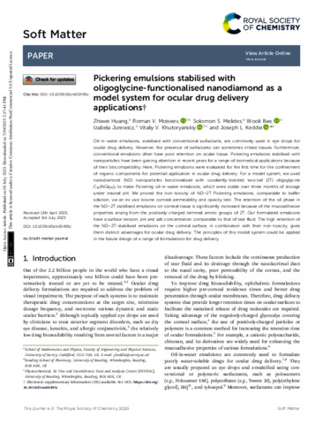Huang, Z., Moiseev, R. V. orcid id iconORCID: https://orcid.org/0000-0002-4358-9981, Melides, S. S., Bae, W., Jurewicz, I., Khutoryanskiy, V. V. orcid id iconORCID: https://orcid.org/0000-0002-7221-2630 and Keddie, J. L. (2023) Pickering emulsions stabilised with oligoglycine-functionalised nanodiamond as a model system for ocular drug delivery applications. Soft Matter, 19 (29). pp. 5513-5526. ISSN 1744-683X doi: 10.1039/D3SM00495C