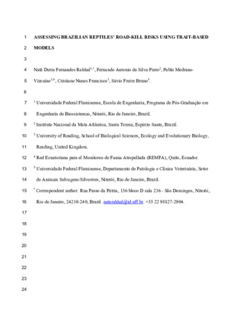Rahhal, N. D. F. orcid id iconORCID: https://orcid.org/0000-0002-9652-5754, Pinto, F. A. S. orcid id iconORCID: https://orcid.org/0000-0002-8814-3182, Medrano-Vizcaíno, P. orcid id iconORCID: https://orcid.org/0000-0003-3122-048X, Francisco, C. N. orcid id iconORCID: https://orcid.org/0000-0002-8688-9810 and Bruno, S. F. orcid id iconORCID: https://orcid.org/0000-0002-7267-9310 (2023) Assessing Brazilian reptiles' road‐kill risks using trait‐based models. Austral Ecology, 48 (7). pp. 1361-1382. ISSN 1442-9993 doi: 10.1111/aec.13383