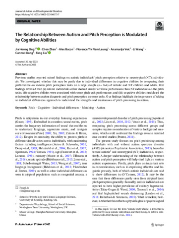 Ong, J. H. orcid id iconORCID: https://orcid.org/0000-0003-1503-8311, Zhao, C., Bacon, A., Leung, F. Y. N., Veic, A., Wang, L., Jiang, C. and Liu, F. orcid id iconORCID: https://orcid.org/0000-0002-7776-0222 (2023) The relationship between autism and pitch perception is modulated by cognitive abilities. Journal of Autism and Developmental Disorders. ISSN 0162-3257 doi: 10.1007/s10803-023-06075-7