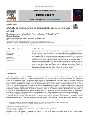 Hong, S., YAo, F., Zhang, F., Ding, Y. and Yang, S.-H. orcid id iconORCID: https://orcid.org/0000-0003-0717-5009 (2023) LPWC: long preamble wake-up communication protocol for a LoRa network. Internet of Things, 22. 100787. ISSN 2542-6605 doi: 10.1016/j.iot.2023.100787