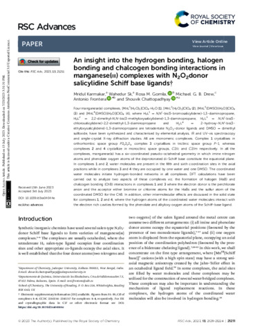 Karmakar, M., Sk, W., Gomila, R. M. orcid id iconORCID: https://orcid.org/0000-0002-0827-8504, Drew, M. G. B., Frontera, A. orcid id iconORCID: https://orcid.org/0000-0001-7840-2139 and Chattopadhyay, S. orcid id iconORCID: https://orcid.org/0000-0001-7772-9009 (2023) An insight into the hydrogen bonding, halogen bonding and chalcogen bonding interactions in manganese(III) complexes with N2O2donor salicylidine Schiff base ligands. RSC Advances, 13 (31). pp. 21211-21224. ISSN 2046-2069 doi: 10.1039/d3ra04044e