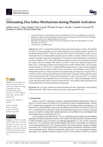 Kuravi, S. J., Ahmed, N. S., Taylor, K. A. orcid id iconORCID: https://orcid.org/0000-0002-4599-7727, Capes, E. M., Bye, A. orcid id iconORCID: https://orcid.org/0000-0002-2061-2253, Unsworth, A. J., Gibbins, J. M. orcid id iconORCID: https://orcid.org/0000-0002-0372-5352 and Pugh, N. (2023) Delineating zinc influx mechanisms during platelet activation. International Journal of Molecular Sciences, 24 (14). 11689. ISSN 1422-0067 doi: 10.3390/ijms241411689