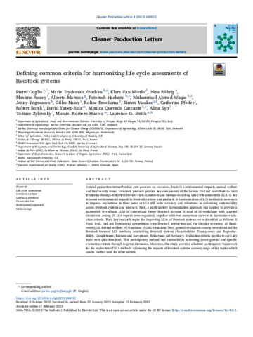 Goglio, P., Knudsen, M. T., Van Mierlo, K., Röhrig, N., Fossey, M., Maresca, A., Hashemi, F., Waqas, M. A., Yngvesson, J., Nassy, G., Broekema, R., Moakes, S., Pfeifer, C., Borek, R., Yanez-Ruiz, D., Quevedo Cascante, M., Syp, A., Zylowsky, T., Romero-Huelva, M. and Smith, L. G. orcid id iconORCID: https://orcid.org/0000-0002-9898-9288 (2023) Defining common criteria for harmonizing life cycle assessments of livestock systems. Cleaner Production Letters, 4. 100035. ISSN 2666-7916 doi: 10.1016/j.clpl.2023.100035