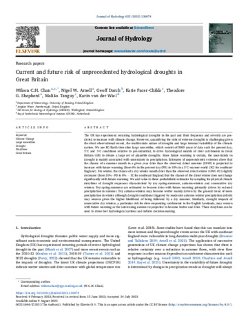 Chan, W. C.H., Arnell, N. W. orcid id iconORCID: https://orcid.org/0000-0003-2691-4436, Darch, G., Facer-Childs, K., Shepherd, T. G. orcid id iconORCID: https://orcid.org/0000-0002-6631-9968, Tanguy, M. and van der Wiel, K. (2023) Current and future risk of unprecedented hydrological droughts in Great Britain. Journal of Hydrology, 625. 130074. ISSN 0022-1694 doi: 10.1016/j.jhydrol.2023.130074