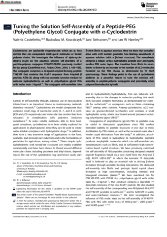 Castelletto, V., Kowalczyk, R. M. orcid id iconORCID: https://orcid.org/0000-0002-3926-6530, Seitsonen, J. and Hamley, I. W. orcid id iconORCID: https://orcid.org/0000-0002-4549-0926 (2023) Tuning the solution self‐assembly of a peptide‐PEG (polyethylene glycol) conjugate with alpha‐cyclodextrin. ChemBioChem, 24 (19). e202300472. ISSN 1439-7633 doi: 10.1002/cbic.202300472