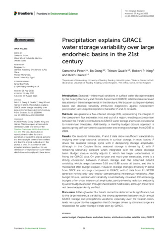 Petch, S., Dong, B., Quaife, T. orcid id iconORCID: https://orcid.org/0000-0001-6896-4613, King, R. P. and Haines, K. orcid id iconORCID: https://orcid.org/0000-0003-2768-2374 (2023) Precipitation explains GRACE water storage variability over large endorheic basins in the 21st century. Frontiers in Environmental Science, 11. ISSN 2296-665X doi: 10.3389/fenvs.2023.1228998