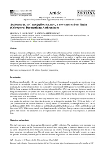 During an examination of Spanish Anthrenus spp. held in Andreas Herrmann's private collection, four specimens of a new species were noted: Anthrenus (Anthrenus) semipallens. Images of habitus features, including antenna, are presented and compared with other Anthrenus species thought to occur in Spain. A. semipallens is small so some comparison species could be eliminated courtesy of size. Although A. semipallens doesn't resemble the colour pattern of any other species, the possibility that A. semipallens is an unknown colour variant of a comparison species was considered. The A. semipallens specimens were dissected and the aedeagus compared with aedeagi from all other possible species. There was no similarity. Anthrenus semipallens is a valid new species.