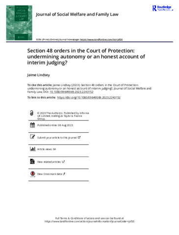 Lindsey, J. (2023) Section 48 orders in the Court of Protection: undermining autonomy or an honest account of interim judging? Journal of Social Welfare and Family Law, 45 (3). pp. 294-297. ISSN 1469-9621 doi: 10.1080/09649069.2023.2243152