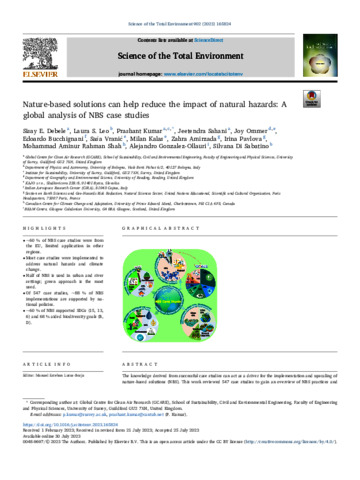 Debele, S. E., Leo, L. S., Kumar, P., Sahani, J., Ommer, J., Bucchignani, E., Vranić, S., Kalas, M., Amirzada, Z., Pavlova, I., Shah, M. A. R., Gonzalez-Ollauri, A. and Di Sabatino, S. (2023) Nature-based solutions can help reduce the impact of natural hazards: a global analysis of NBS case studies. The Science of the total environment. 165824. ISSN 1879-1026 doi: 10.1016/j.scitotenv.2023.165824
