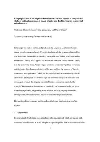 In this paper we explore multilingual practices in the Linguistic Landscape which are geared towards commercial goals. We study simultaneously the commercial areas of two conflict-affected communities in Nicosia (Cyprus) which are divided by a UN-controlled buffer zone. Ledras (Greek-Cypriot) is a street in the south and Arasta (Turkish-Cypriot) is in the north of the divide. We investigate how these communities’ political economies and ideologies shape language choice in public space and how the language of the other community, namely Greek or Turkish, is discursively framed as economically valuable or worthless. Photographs of shopfront signs and a thematic analysis of interviews with shopkeepers revealed that language choice in Nicosia’s commercial area is highly strategic. We demonstrate that this area is a politically and economically charged space where language battles, triggered by power relations, differing language hierarchies, ideologies, and political economies, become visible in the LL.