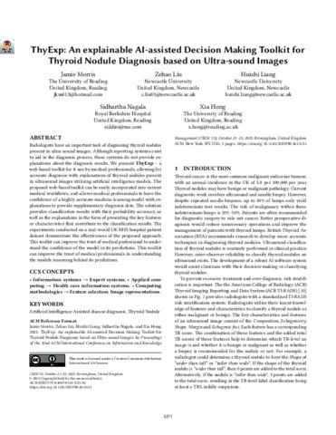 Radiologists have an important task of diagnosing thyroid nodules present in ultra sound images. Although reporting systems exist to aid in the diagnosis process, these systems do not provide explanations about the diagnosis results. We present ThyExp – a web based toolkit for it use by medical professionals, allowing for accurate diagnosis with explanations of thyroid nodules present in ultrasound images utilising artificial intelligence models. The proposed web-based toolkit can be easily incorporated into current medical workflows, and allows medical professionals to have the confidence of a highly accurate machine learning model with explanations to provide supplementary diagnosis data. The solution provides classification results with their probability accuracy, as well as the explanations in the form of presenting the key features or characteristics that contribute to the classification results. The experiments conducted on a real-world UK NHS hospital patient dataset demonstrate the effectiveness of the proposed approach. This toolkit can improve the trust of medical professional to understand the confidence of the model in its predictions. This toolkit can improve the trust of medical professionals in understanding the models reasoning behind its predictions.