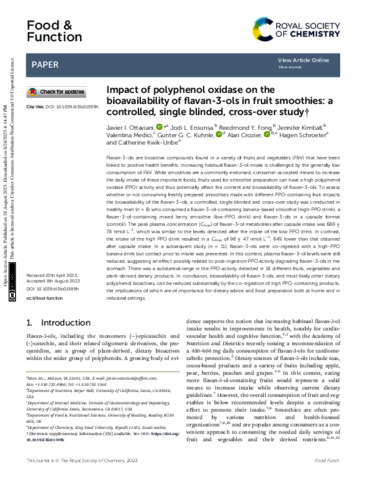 Ottaviani, J. I. orcid id iconORCID: https://orcid.org/0000-0002-4909-0452, Ensunsa, J. L. orcid id iconORCID: https://orcid.org/0000-0001-5331-6170, Fong, R. Y., Kimball, J., Medici, V., Kuhnle, G. G. C. orcid id iconORCID: https://orcid.org/0000-0002-8081-8931, Crozier, A. orcid id iconORCID: https://orcid.org/0000-0001-7581-6782, Schroeter, H. and Kwik-Uribe, C. (2023) Impact of polyphenol oxidase on the bioavailability of flavan-3-ols in fruit smoothies: a controlled, single blinded, cross-over study. Food & Function, 14 (18). pp. 8217-8228. ISSN 2042-650X doi: 10.1039/D3FO01599H